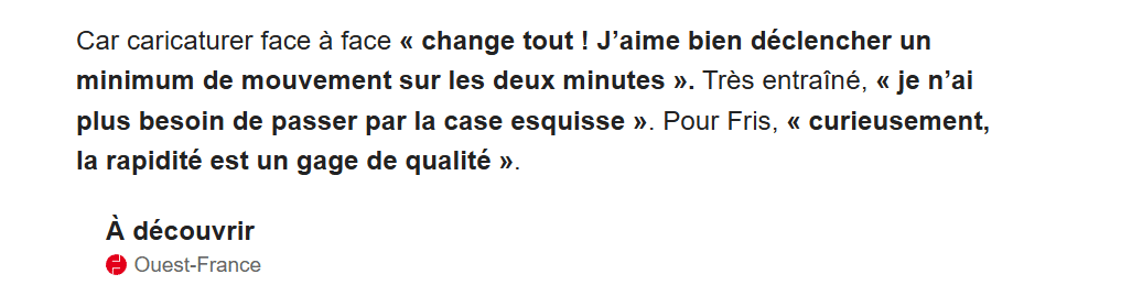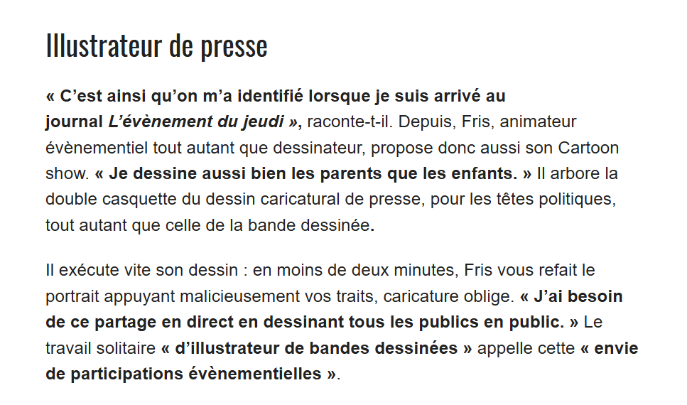 Article d'une demi-page sur Fris, heureux gagnant du festival de la caricature de St Esteve pour ses deux une dans libération, titré : "L'oeil qui frise et le sourire colgate, auto-portrait de Fris"